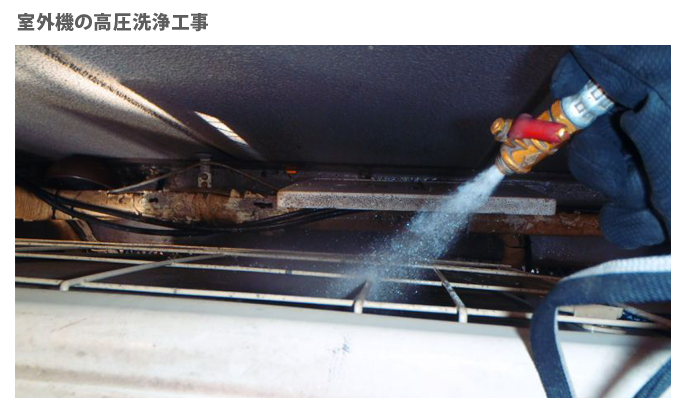 室外機の熱交換器にアルミフィンクリーナーを噴霧し汚れを浮かしたら高圧洗浄機にて徹底的に洗浄を行います。